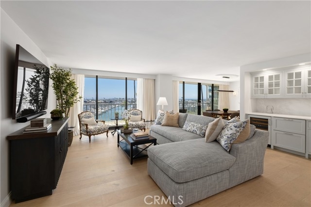 Spectacular recently remodeled luxury condo in the prestigious "601 Lido Park Drive" high-rise. This large corner single level residence with panoramic views of the ocean and Lido Channel is located on the bay in the Lido Village Cannery area of Newport Beach. Designed for casual elegance, this waterfront 2 bedroom, 2 1/2 bath home features an open living area with white oak flooring, wine cooler, wet bar, spacious seating and dining area all of which open to a large patio incorporating the indoor/outdoor lifestyle of the waterfront. The professional appointed kitchen includes a Wolfe stove, Wolfe oven microwave and Sub-Zero Refrig. Two private main suites with ocean views each with well-appointed baths, dressing area and large closets. The 601 is currently in the final stages of a multi-million dollar refurbishment which has been paid by each owner of over $200,000. Complete building engineering study was completed and includes new unit plumbing, electrical updates, new elevators, hall ways, glass patio enclosures, new pool and hardscape around the entire building. All of this and being located on the Bay within walking distance to Lido Village and top rated restaurants like Nobu, Bear Flag Fish Company, The Cannery, Bluewater Grill, Zinque and Malibu Farms make the 601 one of premium high rise residences in the world. Other 601 amenities include a workout gym, boat docks for Duffy" (based on availably) on-site maintenance, 24 hour doorman and security. The 601 consists of 54 residences and current Costal Commission and City regulation prohibit construction of future high rise residences on the water making the 601 truly one of a kind.