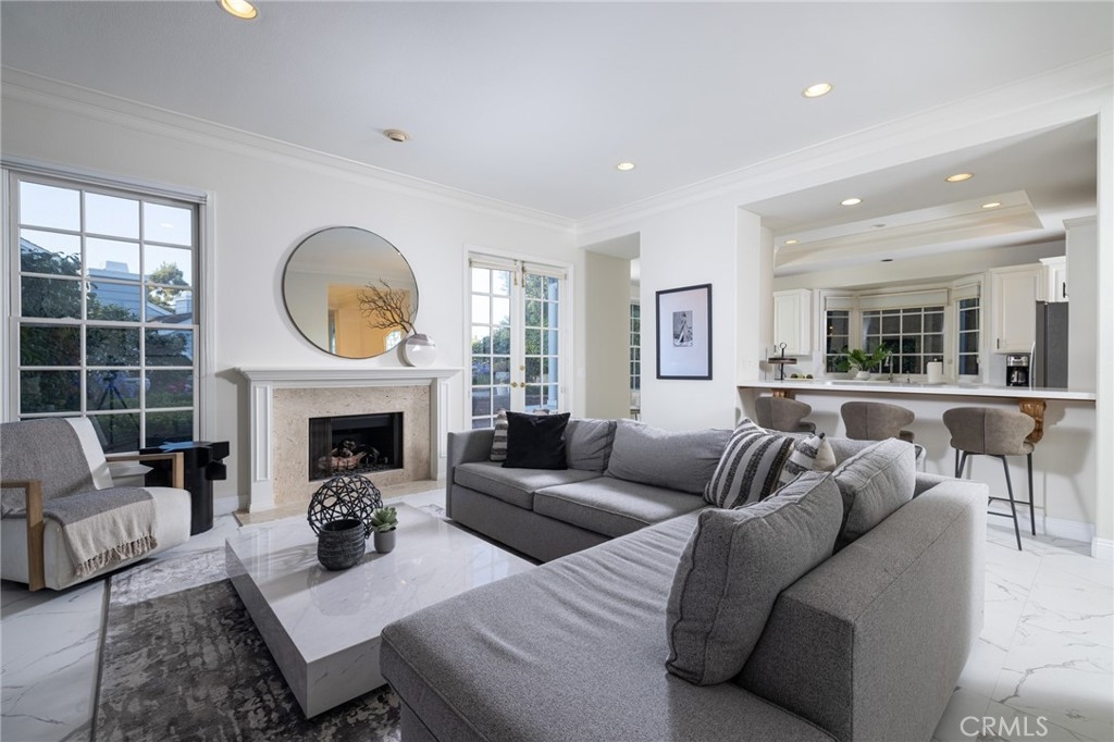 Newly updated and refreshed, this extra-light and luxurious townhome at guard-gated Belcourt in Newport Beach is move-in ready. Enter through a lovely gated courtyard with brick decking and a covered front porch that is as inviting as it is private. Indoors, an open ambiance is enjoyed throughout approximately 3,476 square feet of living space that includes a formal living room with fireplace, built-ins and French doors leading to the courtyard. Entertain impressively in a large formal dining room with classic chandelier and a built-in buffet and wet bar. For casual gatherings, the fireplace-warmed family room opens through a breakfast bar to a newly enhanced kitchen with white cabinetry, bay window, breakfast nook, pantry, wine refrigerator, and quartz countertops with matching backsplash. The kitchen and family area offers easy access to a beautiful and peaceful backyard complete with a custom fountain, views of Saddleback Mountain and raised beds of colorful flowers. Three bedrooms and three-and-one-half baths are on display, including a secondary ensuite bedroom with custom bath, and another secondary bedroom that can easily become a junior primary suite. Vaulted ceilings soar over the main primary suite, where a sitting room shares a see-through fireplace with the bedroom and a lavish bath showcases a soaking tub, separate shower, two sinks, a sit-down vanity and a walk-in closet. Notable appointments are led by new large-format porcelain tile throughout the first level, new designer paint, new carpet upstairs, wainscoting, crown molding, plantation shutters, a laundry room with sink and cabinetry, and a three-car garage. Located in the intimate limited-edition Towne Collection enclave at Belcourt, the residence includes exclusive access to a private community pool and spa. High-end shopping and dining awaits at Fashion Island, and beaches, Corona del Mar’s village, Irvine and Orange County’s airport are only minutes from home.