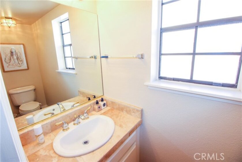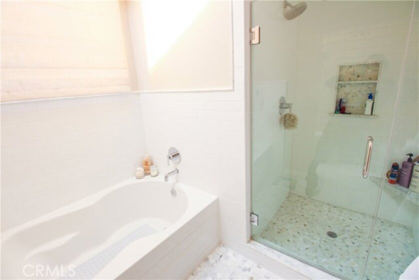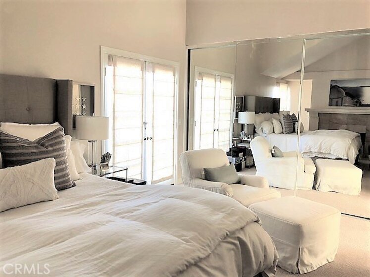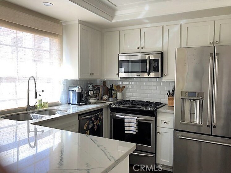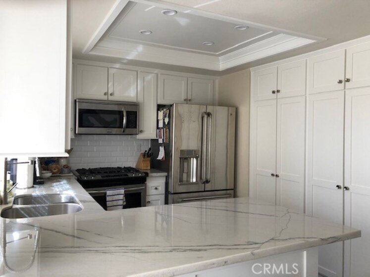 Highly upgraded 2 bedroom, 2.5 bath home. Recent remodeling features include a kitchen with Quartzite counters, beveled tile backsplash, SS appliances, new sink, faucet, and trey lighting. The inviting living room is highlighted by a stunning custom, built in wall unit accented by a wet bar, wine storage, wine refrigerator, bookshelves, and Quartzite counter with Carrera marble tile backsplash. A separate dining room is adjacent to the kitchen. Main floor upgrades include recessed lighting, hardwood floors, crown moulding, and new baseboards. First bedroom has new carpet, mirrored wardrobes and a full private bath with a Travertine tile topped vanity. Spacious master bedroom (20x13) features wall to wall mirrored wardrobes, gas fireplace, dressing area and a remodeled master bath with subway tile surrounds of tub and separate shower, flooring of marble tile that extends to the shower floor, hingeless glass shower door, and Caesarstone vanity counter top. There are 2 balconies: the larger one through the French doors in the living room and a smaller, private one in the master bedroom. The interior of the home has been newly painted. Property is located less than one mile from the beach.