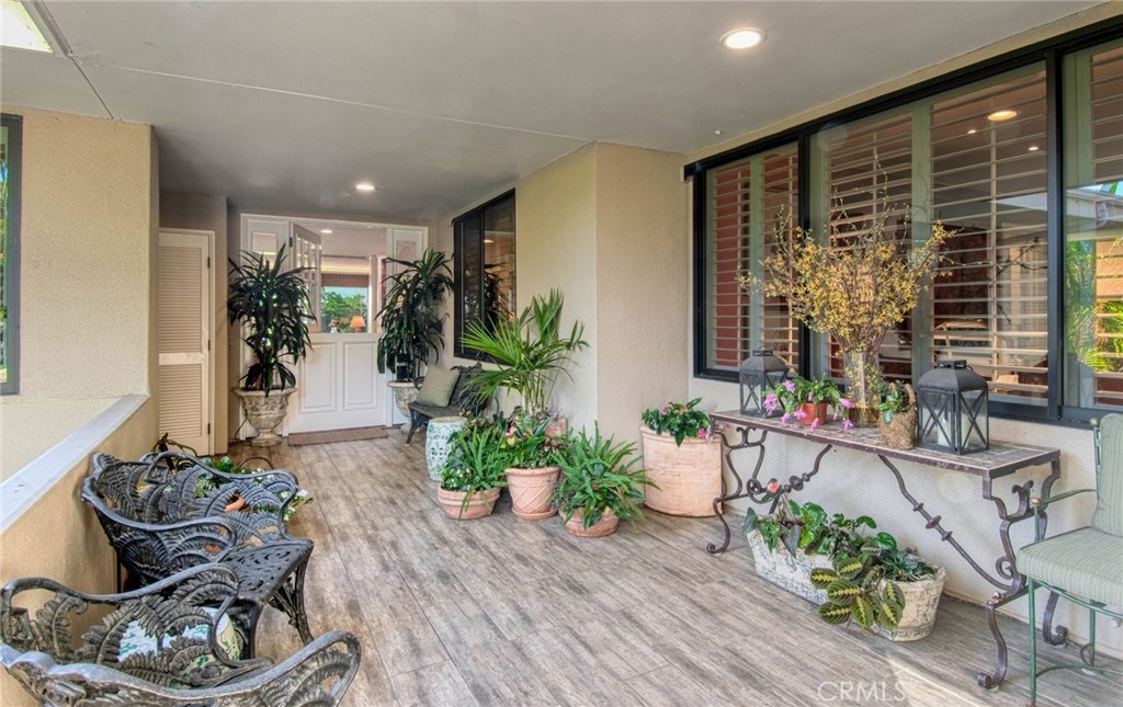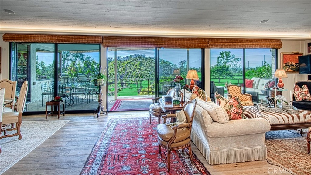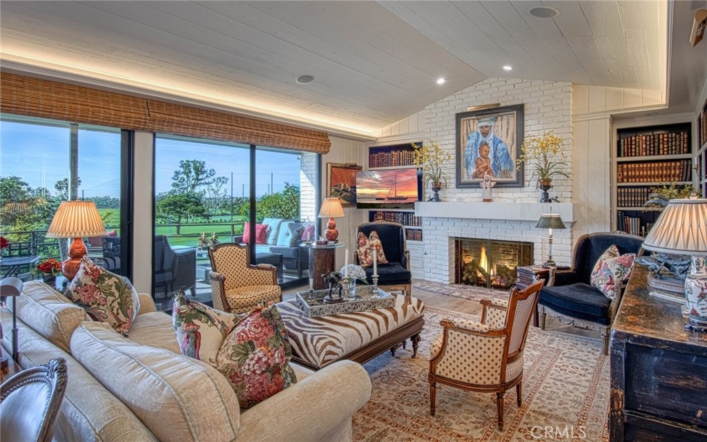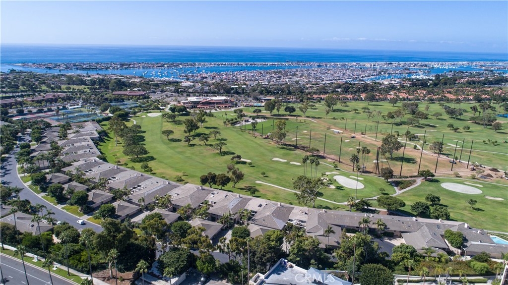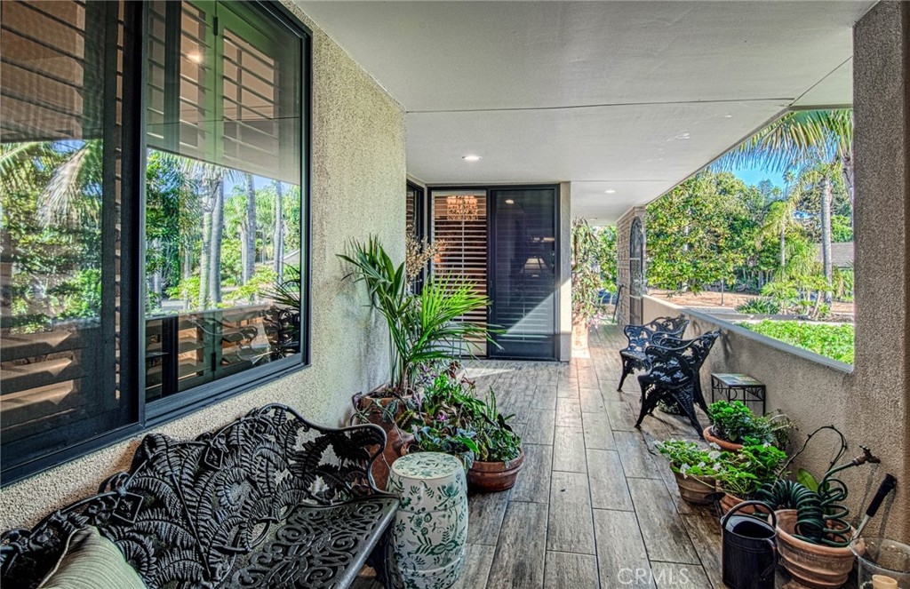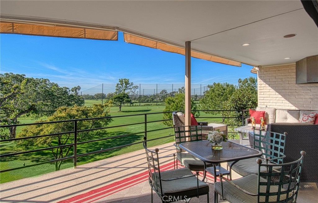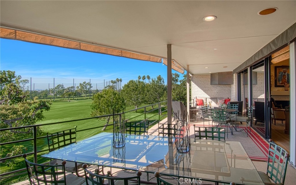 Ideally situated within the exclusive confines of the private guard-gated community of Granville, this corner unit stands out as one of the most distinctive residences within the neighborhood. Ascending to the upper-level abode, one is immediately enveloped in a grand sense of space, accentuated by vaulted ceilings and expansive floor-to-ceiling windows that grace the living and dining areas. These windows unveil a vast deck, offering sweeping panoramic views of the Newport Beach Country Club's picturesque 9th fairway. Adjacent to this outdoor haven is a separate, permitted space, perfect for an office, gym, or even a private sleeping area. The kitchen, a culinary haven, boasts an eat-in dining area, a sizable island with a built-in desk, a top-of-the-line Viking stove, built-in refrigerator, and adorned with elegant granite countertops. Seamlessly connected to the dining space and living room, the kitchen enhances the property's single-story layout, creating an open, airy ambiance. The living room features a fireplace embraced by custom built-ins, contributing to the overall sense of spaciousness and luminosity.Traversing the generously proportioned, sky-lit hallway, one discovers the expansive secondary bedroom, a well-appointed laundry room with a sink and built-in storage, and a bathroom with a sleek glass-enclosed shower. The primary suite, accessed through a commodious sitting area/library, is a retreat of opulence. Vaulted ceilings, a walk-in closet equipped with custom cabinets, and a spa-like master bath, replete with a stone shower, dual vanities, and ample storage, define the epitome of luxury. The residence is adorned with premium upgrades, including stunning wide-plank wood floors, custom window coverings, exquisite woodwork, recessed lighting, and recently installed forced air heat and air conditioning. This property seamlessly combines upscale living with breathtaking views, creating a truly unique and inviting haven within the Granville community.