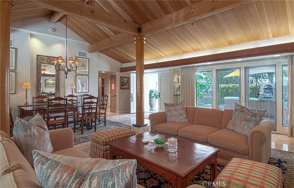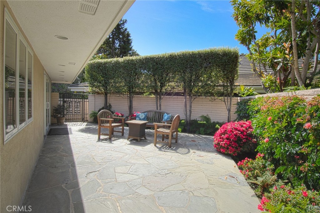 Situated within the exclusive, guard-gated enclave of Granville, this exceptional detached home seamlessly blends functionality with sophisticated design, offering an unparalleled living experience. Tucked away in a serene, private setting surrounded by lush, mature landscaping, this highly upgraded residence is a true sanctuary for the discerning buyer. Upon entering, the eye is immediately drawn to the dramatic Douglas Fir vaulted ceilings, soaring above a sun-drenched great room designed for both grand entertaining and intimate gatherings. A striking fireplace with a custom stone surround serves as the focal point, while the expansive layout provides ample space for formal dining and relaxation. Adjacent to the great room, the chef’s kitchen is a masterpiece of form and function. It boasts slab countertops, custom cabinetry, a spacious center island with a gas cooktop, a Sub-Zero refrigerator, stainless steel appliances, a generous walk-in pantry, and a cozy breakfast nook—perfect for casual dining. The luxurious primary suite offers a tranquil retreat with vaulted ceilings, custom millwork, and exquisite built-in cabinetry. The spa-inspired ensuite bathroom features a walk-in shower, a separate jetted soaking tub, and an oversized walk-in closet designed for maximum storage and organization. The secondary bedrooms are equally spacious, with one currently serving as a stylish office and den. A rare highlight of this Granville home is the separate casita, positioned off the front patio, offering a private and versatile space for guests or a home studio. Designed for seamless indoor-outdoor living, the rear exterior entertaining area is an entertainer’s dream, featuring a built-in grill, mature citrus trees, and a generous patio perfect for al fresco dining and gatherings. Additional upgrades and modern conveniences include dual-paned windows, air conditioning, ceiling fans, recessed lighting, epoxy garage flooring, and abundant in-home storage. Granville is a true hidden gem, offering resort-style amenities, immaculate grounds, and a stunning pool and spa—all just steps from the luxury shopping and dining of Fashion Island. This is a rare opportunity to own a meticulously upgraded home in one of Newport Beach’s most coveted communities. Don’t miss your chance to experience the best of coastal living in Granville.