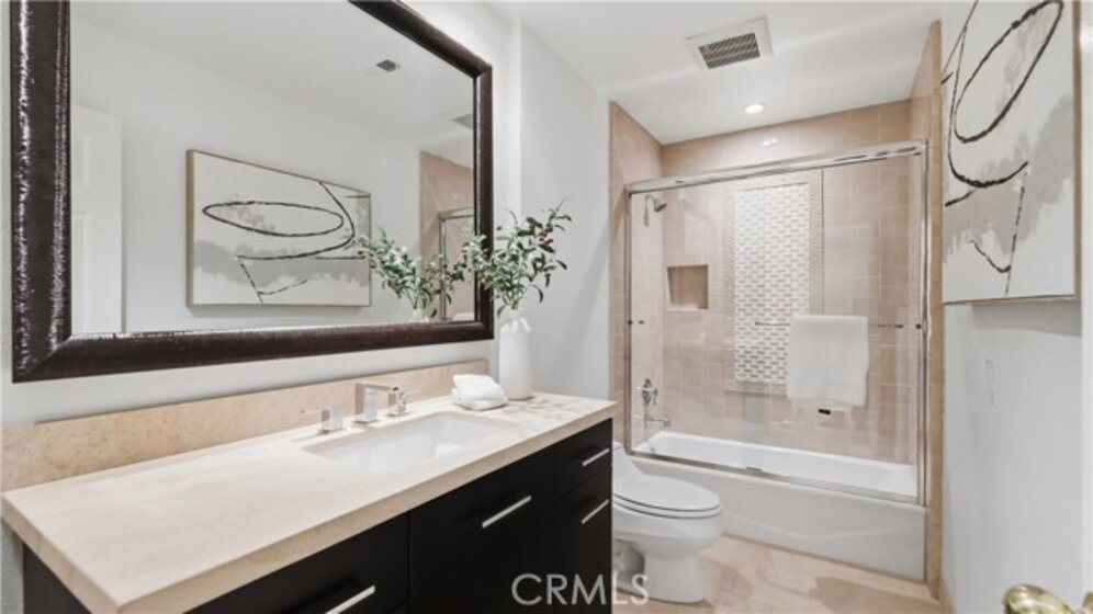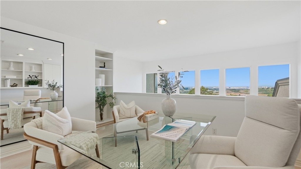 Located within the gated enclave of Harbor Ridge, this 3 bedroom + office, 3 bath residence enjoys elevated city and ocean views, and a thoughtfully designed floor plan that balances privacy and functionality throughout the home. A gated entry leads to a landscaped courtyard, creating a quiet and welcoming arrival. Inside, the interiors are light filled and refreshed, featuring skylights, recessed lighting, and clean, neutral finishes. The main living areas are highlighted by high ceilings and seamless access to multiple outdoor patios, enhancing everyday living and entertaining. The kitchen is designed for both everyday living and entertaining, featuring a center island, black onyx granite countertops, high end appliances, generous storage, and a casual dining area overlooking the garden. A full bathroom is conveniently located on the main level, providing ease of access for guests and daily use. The upstairs office offers built in workspace and a quiet setting, making it well suited for working from home. The primary suite features two walk in closets, including a spacious cedar lined dressing closet, and a well appointed bathroom with dual vanities, a soaking tub, and a separate shower. The suite also opens to a private balcony, offering open views and a peaceful extension of the living space. Residents of Harbor Ridge Estates enjoy access to community pools, spas, tennis courts, and walking trails, all conveniently located near Fashion Island, Pelican Hill, Newport Beach’s coastline, and award-winning schools.