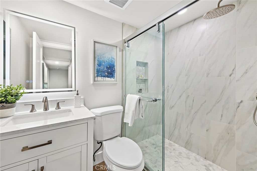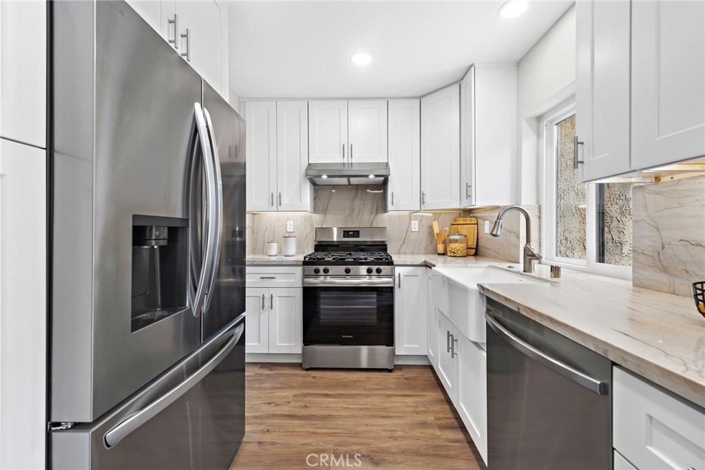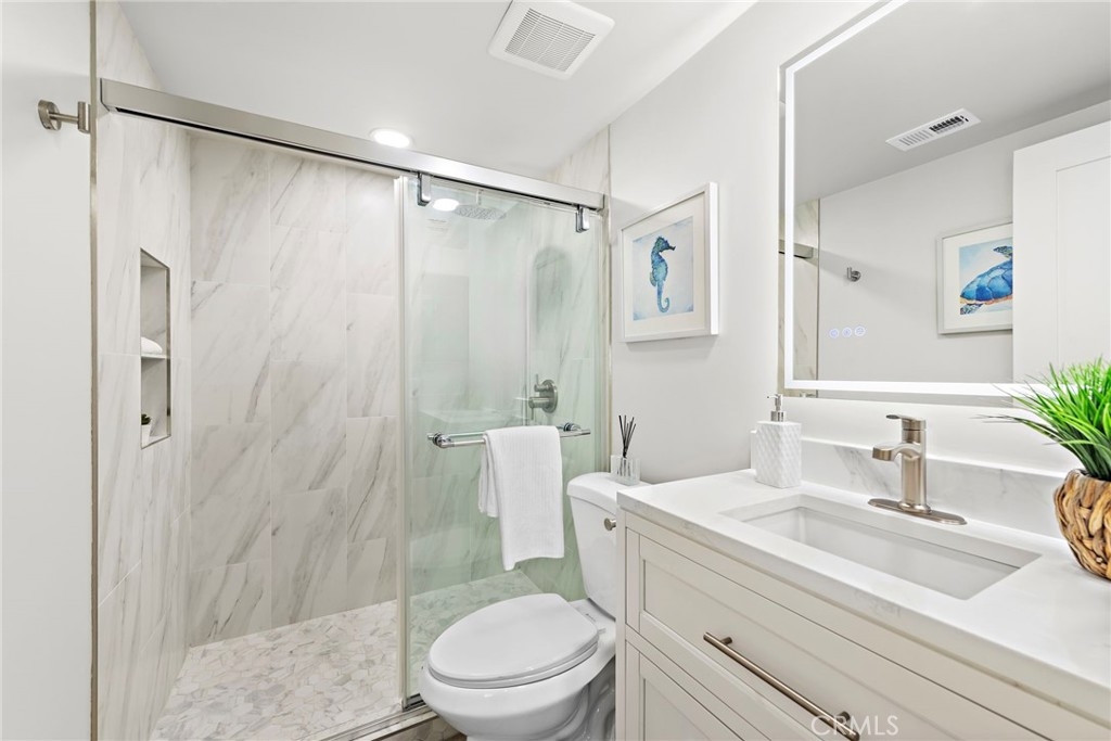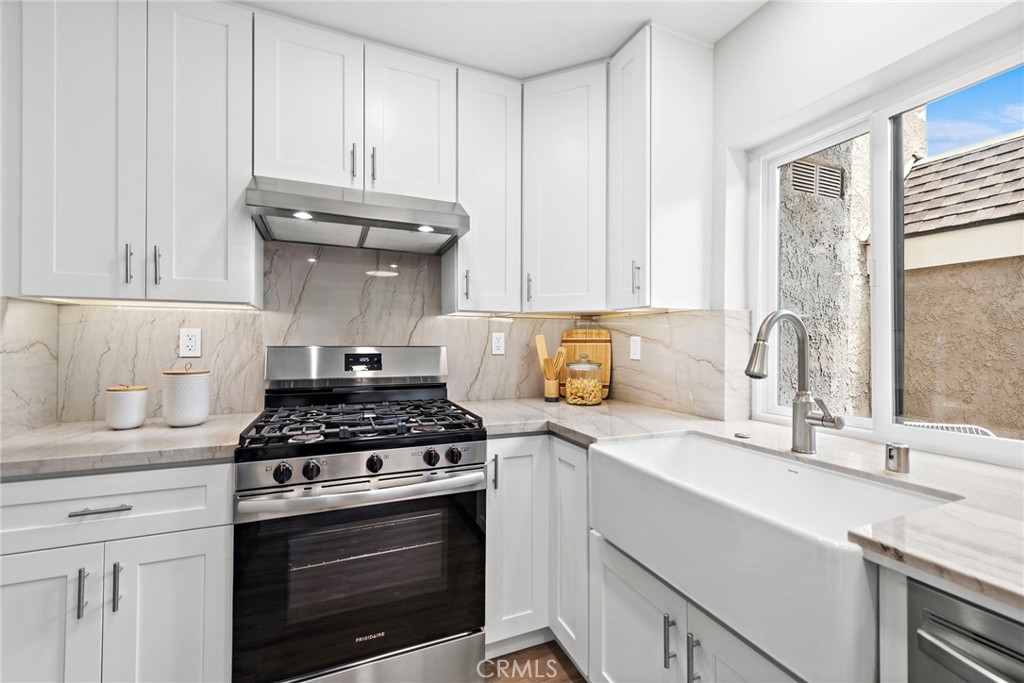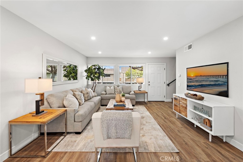 Welcome to 11 Summerwalk in Newport Terrace an impeccably renovated end-unit townhome in Newport Beach, showcasing all brand-new, never-used upgrades throughout. This 3-bedroom, 2.5-bath property has been completely reimagined with high-quality finishes and attention to detail at every turn. The main level offers a light-filled living space with new Milgard windows and a secure sliding door. The kitchen is a true standout, featuring pristine quartzite countertops and backsplash, soft-close custom cabinetry with brushed nickel hardware, a deep farmhouse sink with Moen fixtures, and a full suite of brand-new stainless steel appliances including an LG refrigerator with dual water and ice dispenser, gas range and hood, and dishwasher. A spacious walk-in pantry provides smart storage, while the redesigned powder room adds a touch of style with a new vanity, smart mirror, and modern fixtures. Upstairs, the primary suite boasts vaulted ceilings, a generous closet, and a spa-inspired bath complete with a frameless glass shower, porcelain tile, and Moen rain shower head all completely new and never used. Newport Terrace is a coastal enclave surrounded by natural beauty—located across from Marina View Park and adjacent to Canyon Park, Talbert Reserve, and bike trails that lead straight to the beach. Residents enjoy two pools, a hot tub, sport court, and BBQ/picnic areas and so much more!