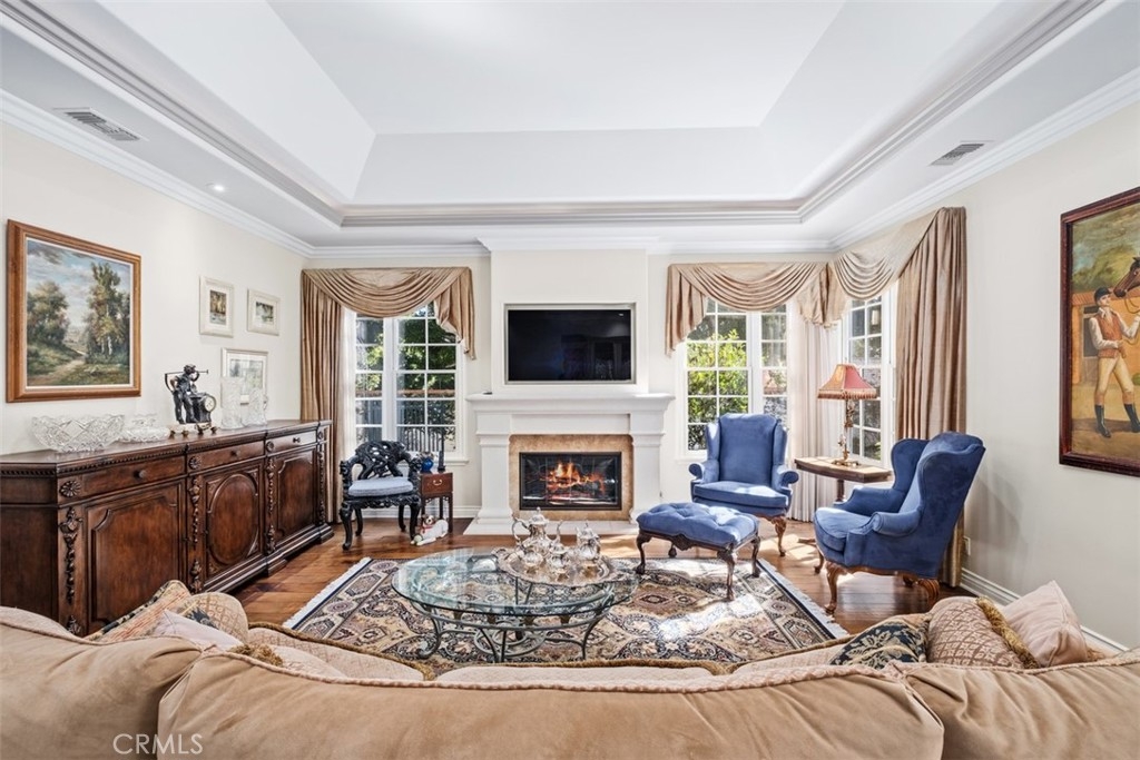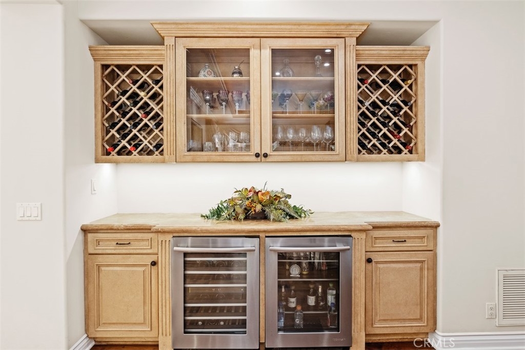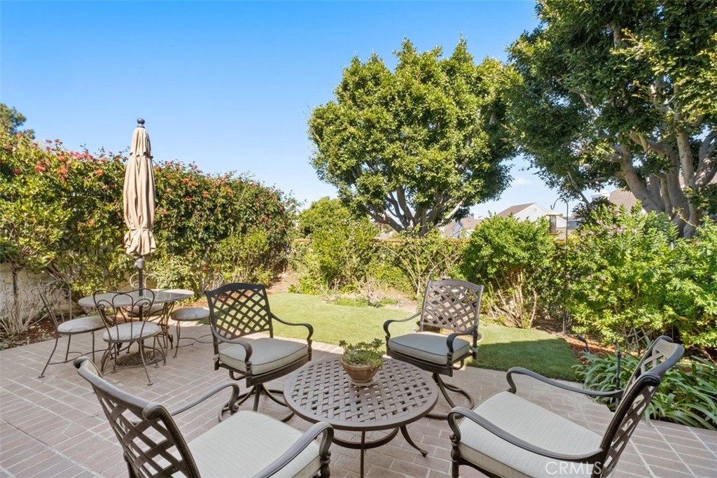 THIS IS IT! This gorgeous single level home will be hard to resist! Ideally located on an elevated corner lot, this home exudes quality throughout. Rustic walnut hardwood floors, Venetian style plaster walls, dramatic coffered ceilings with mood lighting, built-in wine bar with both wine and beverage refrigerators, kitchen offers all the bells and whistles including Viking cooktop, custom cabinets with pull out legs for spices, self closing drawers, built-in plumbed coffee maker, hands free faucet, travertine counters and more. Brick lined central and sunny atrium. Bathrooms with tumbled marble and onyx vessel sinks. Garage offers pebbled floor coating, built in cabinets and work bench and temperature controlled attic for storage. French doors from the master bedroom, formal dining room and breakfast nook all open to a lush private garden with fountain and built-in barbecue. The community pool and amenities located just steps away is stunning! Truly resort living in the heart of Newport Beach!